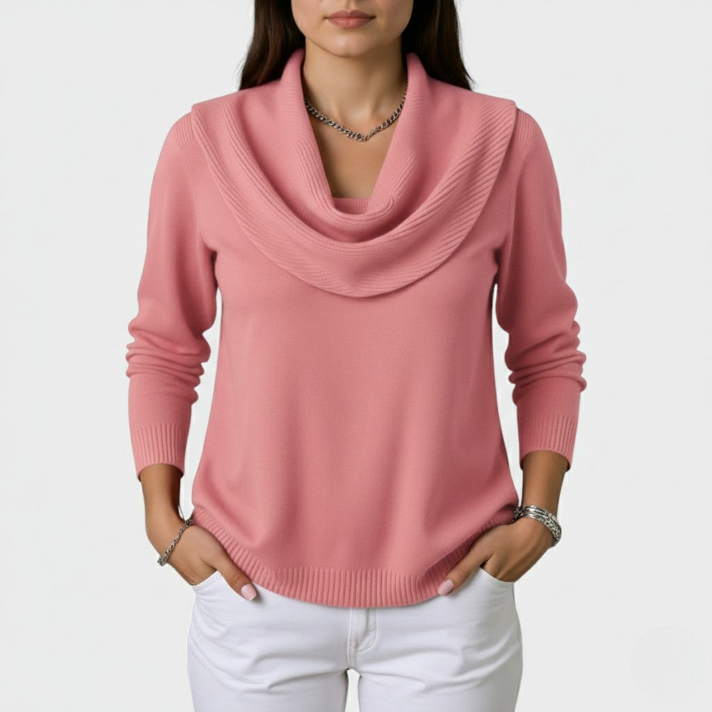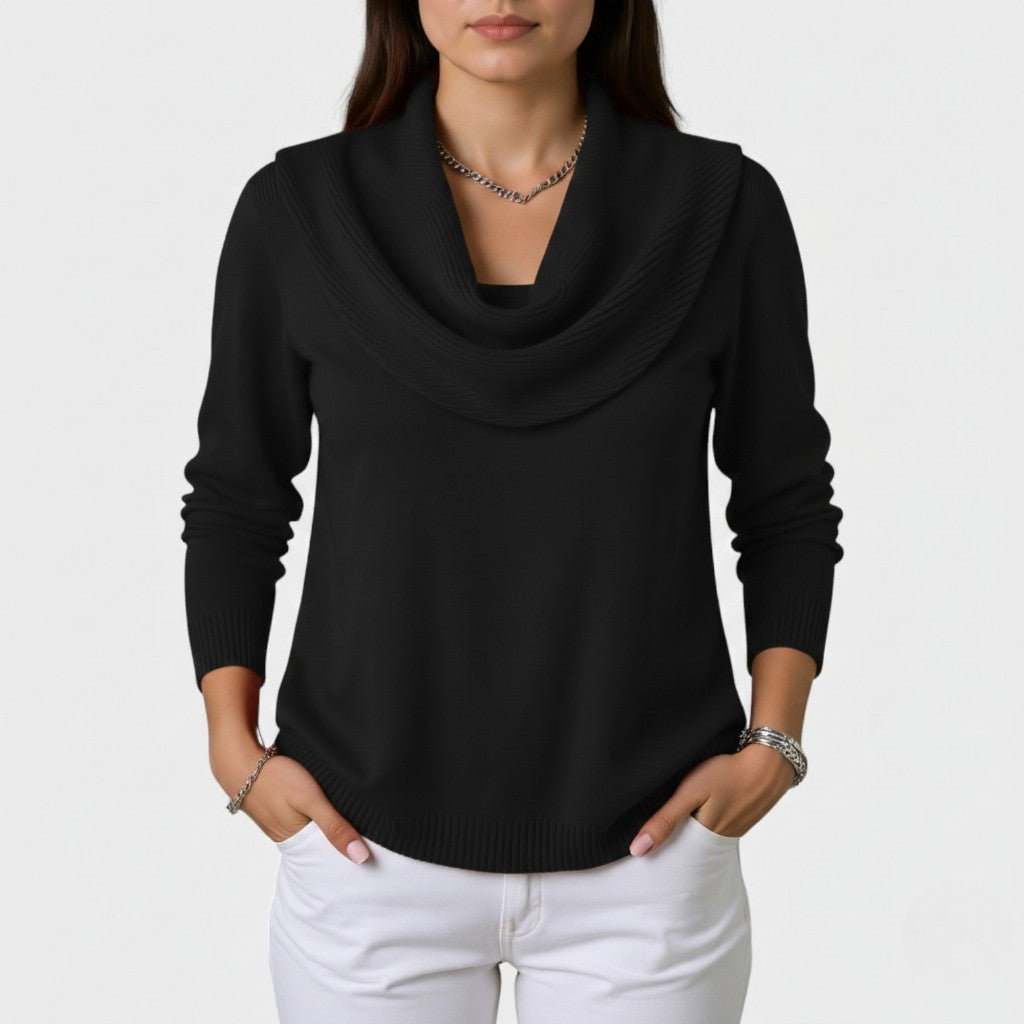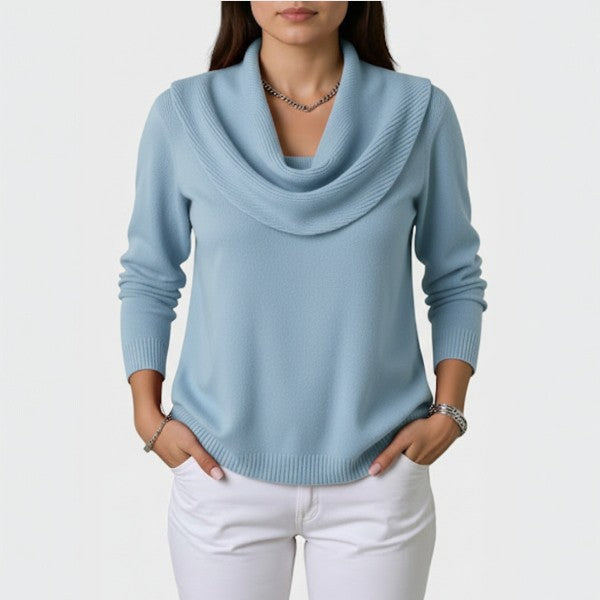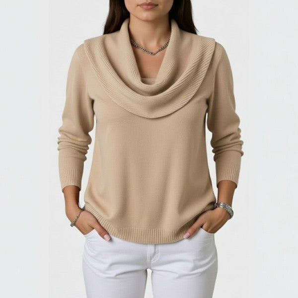 Un pulover elegant și confortabil, cu un guler drapat care adaugă o notă sofisticată și feminină ținutei tale. Țesătura moale se mulează frumos pe corp, oferind o cădere perfectă pentru orice ocazie — fie la birou, fie într-un look casual-chic.