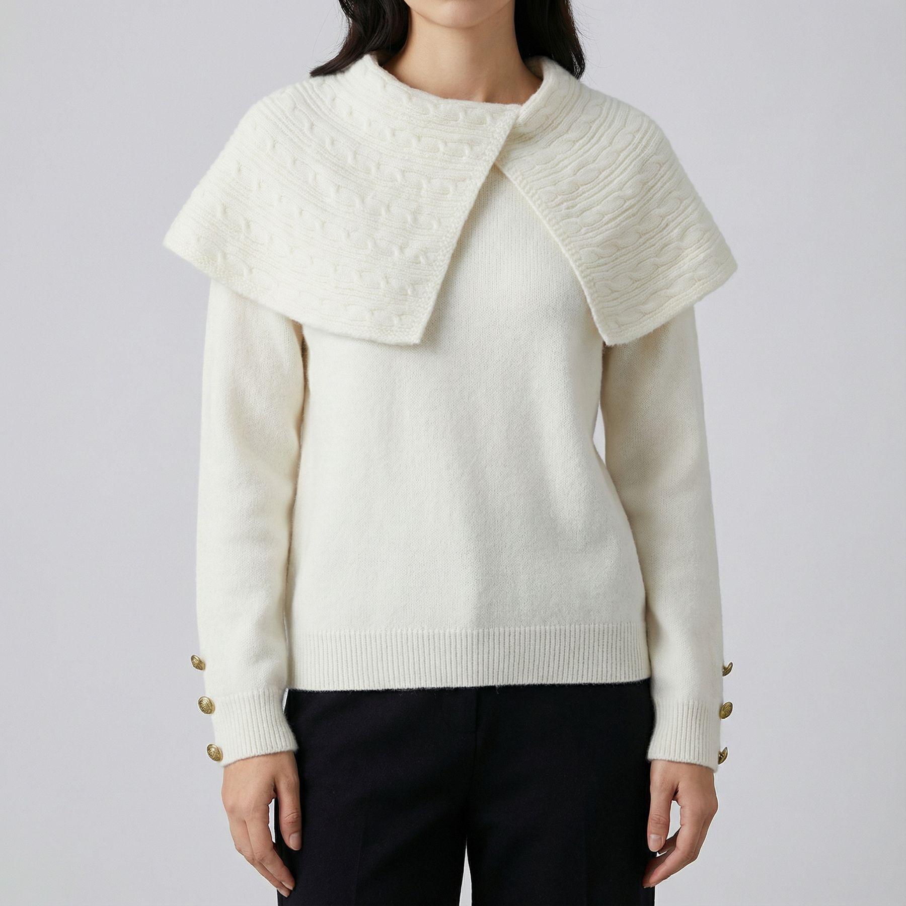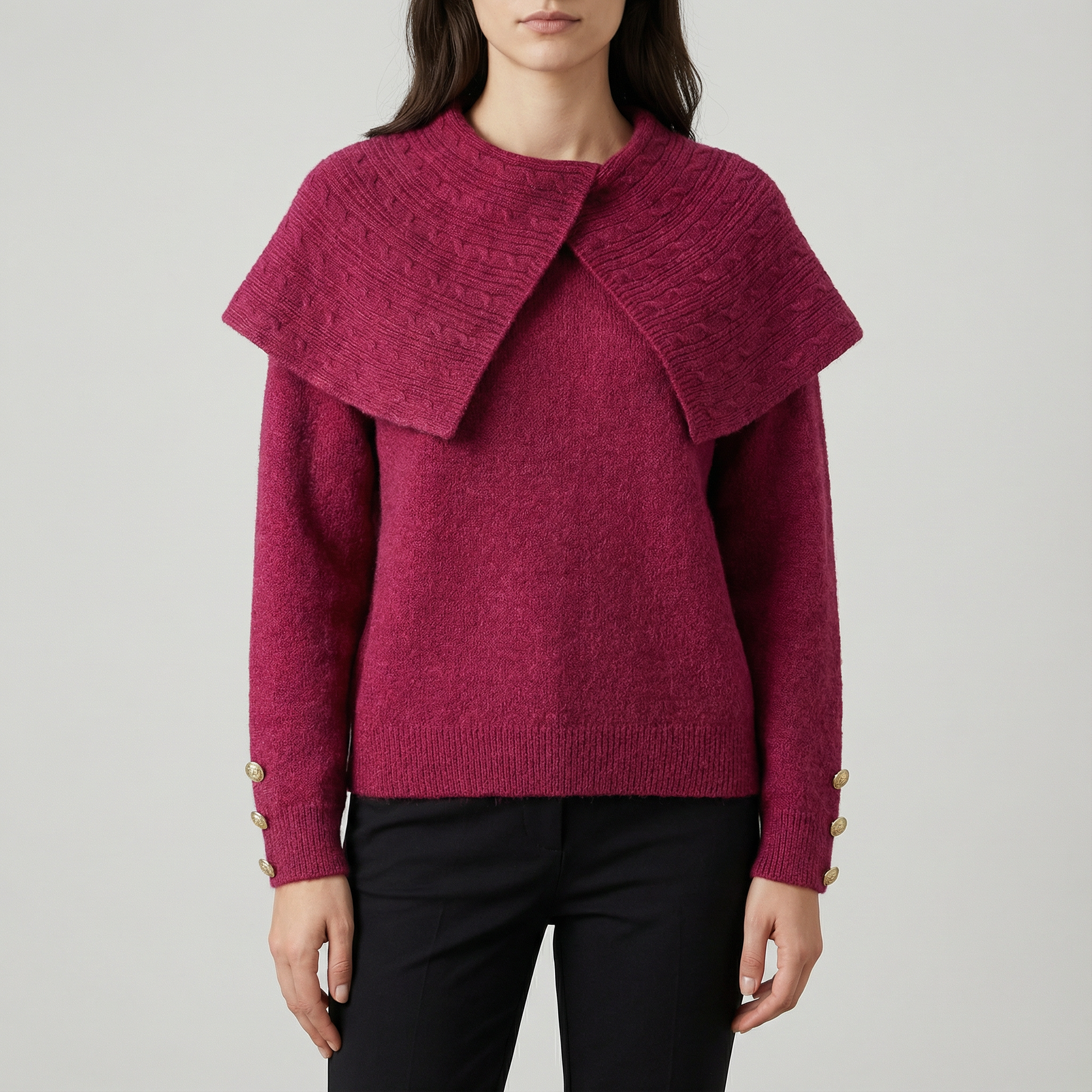 Transformă-ți apariția într-o declarație de stil cu acest pulover spectaculos, care redefinește tricotajul elegant. Vedeta designului este gulerul maxi supradimensionat, cu textură împletită distinctă, care se așază pe umeri asemenea unei pelerine regale. Moale, învăluitor și rafinat, puloverul este completat de detalii metalice fine la manșete, combinând perfect confortul termic cu luxul subtil al unui articol vestimentar premium.