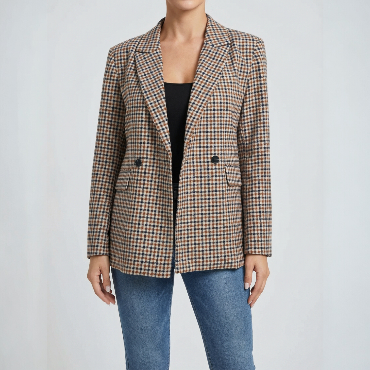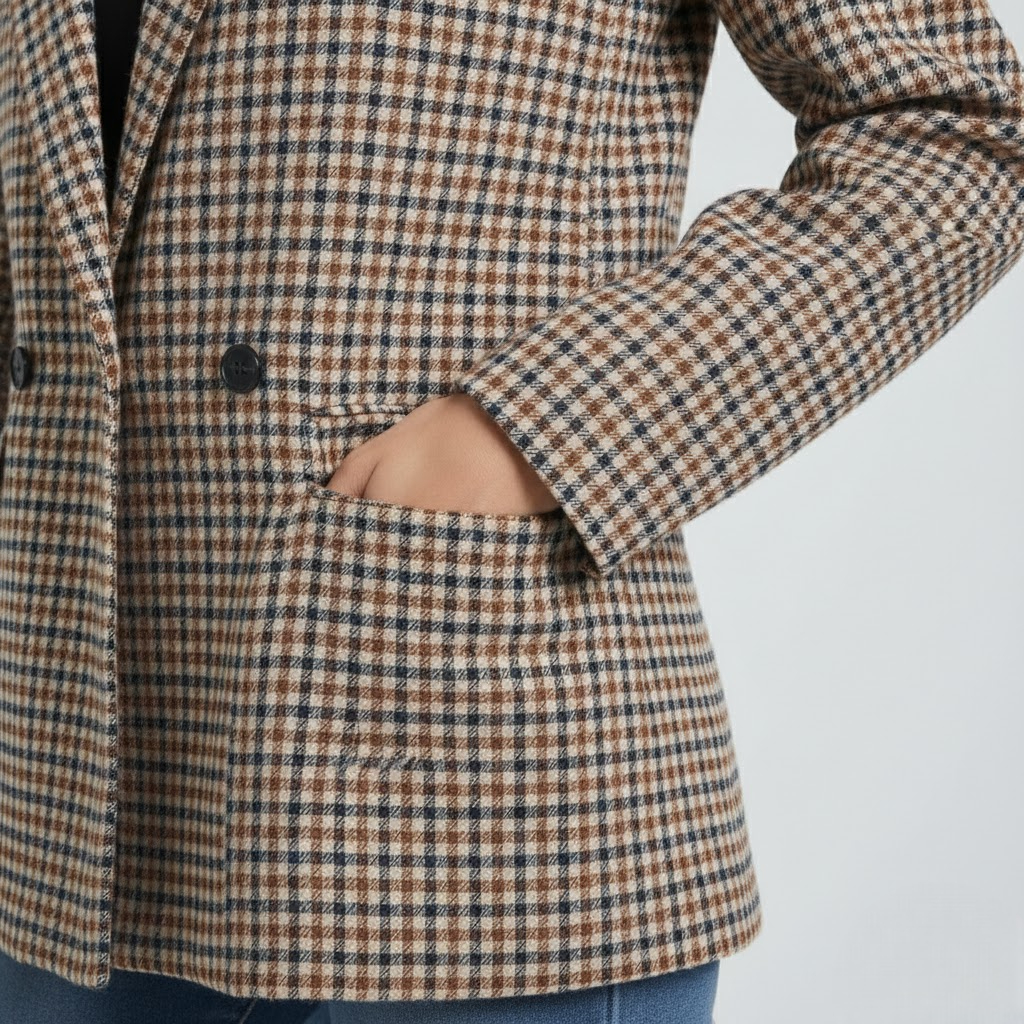 Acest sacou este o reîntoarcere la moda de bun gust, fiind piesa ideală pentru femeia care știe că stilul adevărat nu ține cont de vârstă. Cu o textură bogată și un model discret în carouri, acest sacou emană un aer de noblețe și seriozitate. Croiala sa clasică, cu închidere simplă la doi nasturi, oferă o structură impecabilă ținutei, transformând orice apariție într-o declarație de rafinament subtil. Este alegerea perfectă pentru zilele în care doriți să vă simțiți "pusă la punct", confortabilă și distinsă.