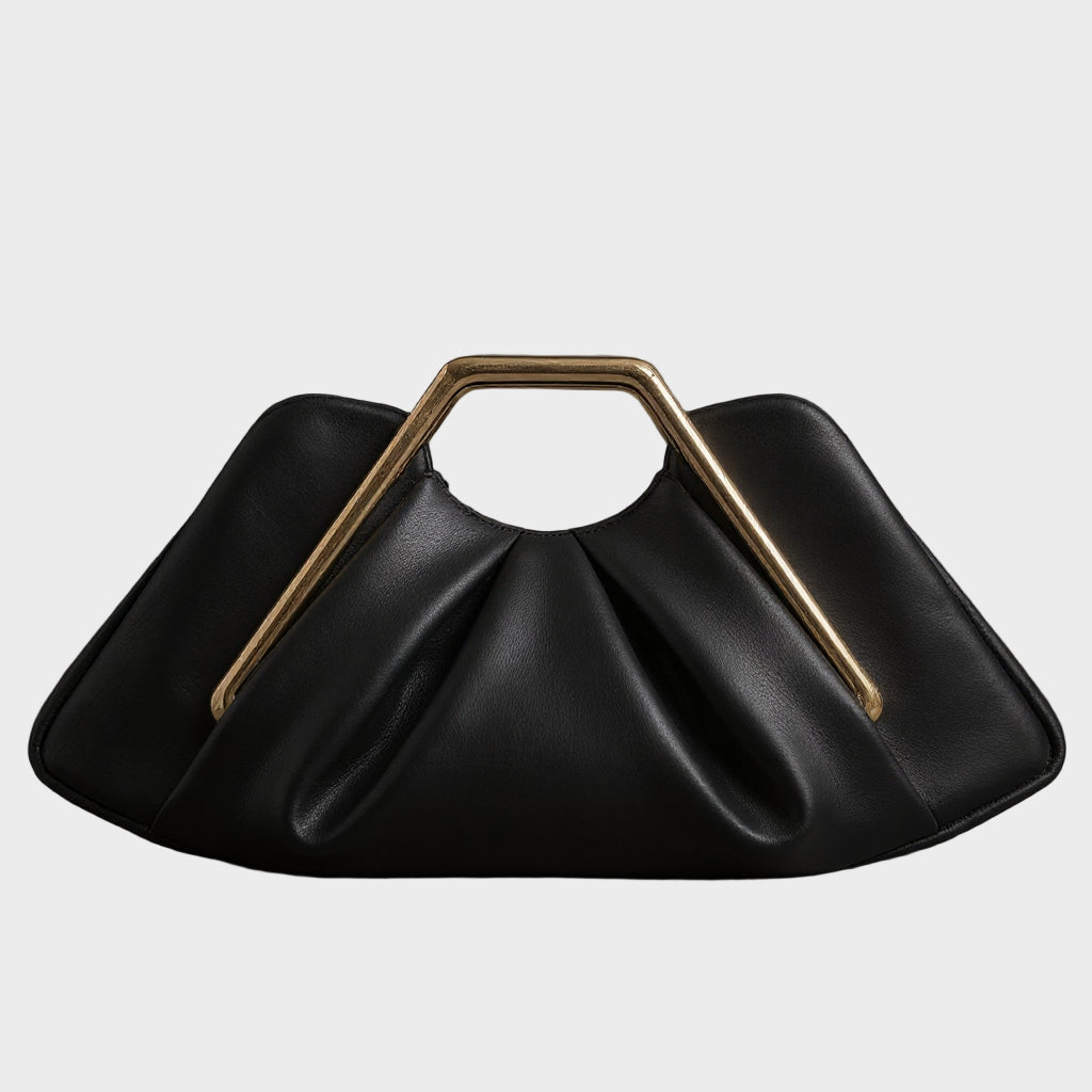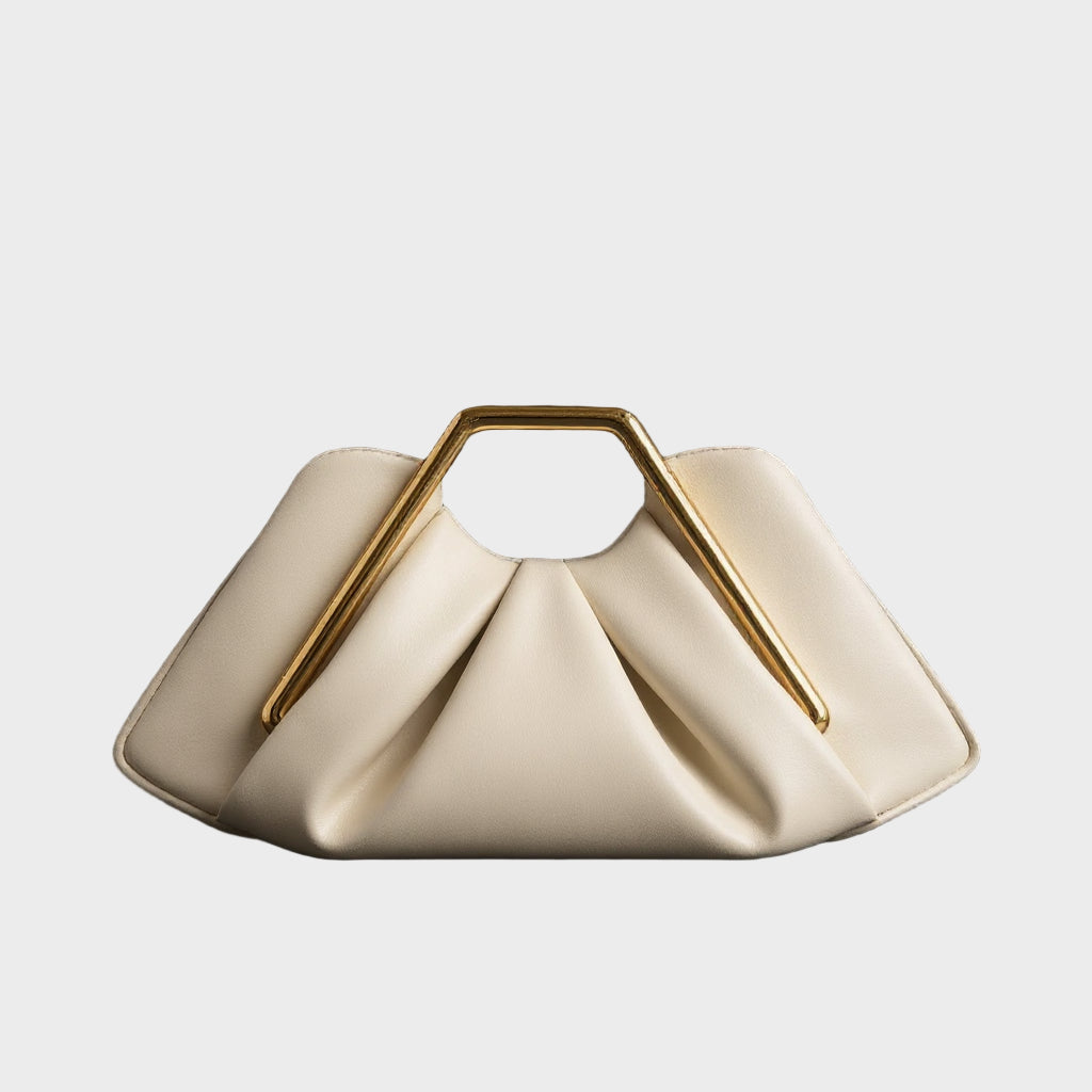 Cadru elegant cu mâner metalic: Cu un mâner metalic elegant, geometric, cu finisaj auriu, această geantă combină luxul și funcționalitatea într-o armonie perfectă. Mânerul adaugă un contrast rafinat corpului moale, asigurând în același timp o prindere sigură și confortabilă. Designul său unghiular accentuează curbura grațioasă a genții, conferindu-i un farmec arhitectural izbitor.