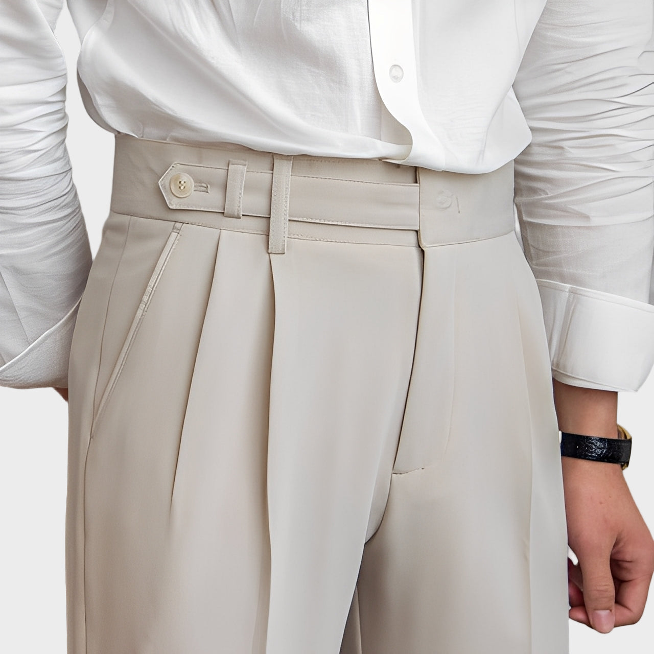 Acești pantaloni aduc croiala inspirată de stilul britanic într-o siluetă contemporană. Fabricați dintr-un material ușor și respirabil, sunt perfecți pentru primăvară și vară. Plieurile frontale și talia reglabilă oferă o croială distinctivă, în timp ce partea de sus mai lejeră și partea conică a piciorului combină eleganța cu confortul. Fie că sunt purtați cu o cămașă sau un tricou, completează orice look cu o sofisticare naturală.