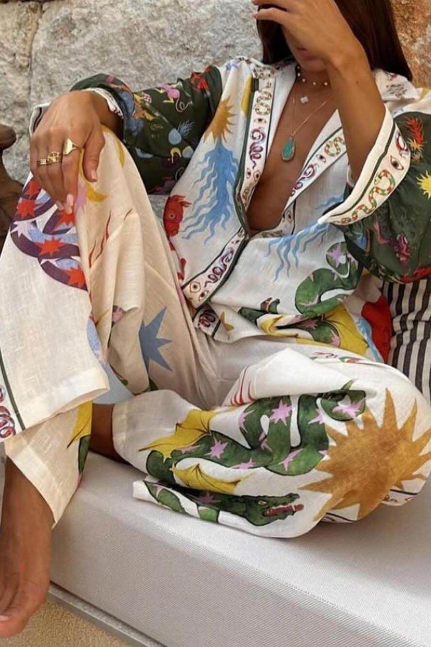 - Croială relaxată, dar rafinată – Cămașă fluidă cu nasturi asociată cu pantaloni cu talie înaltă, ajustați